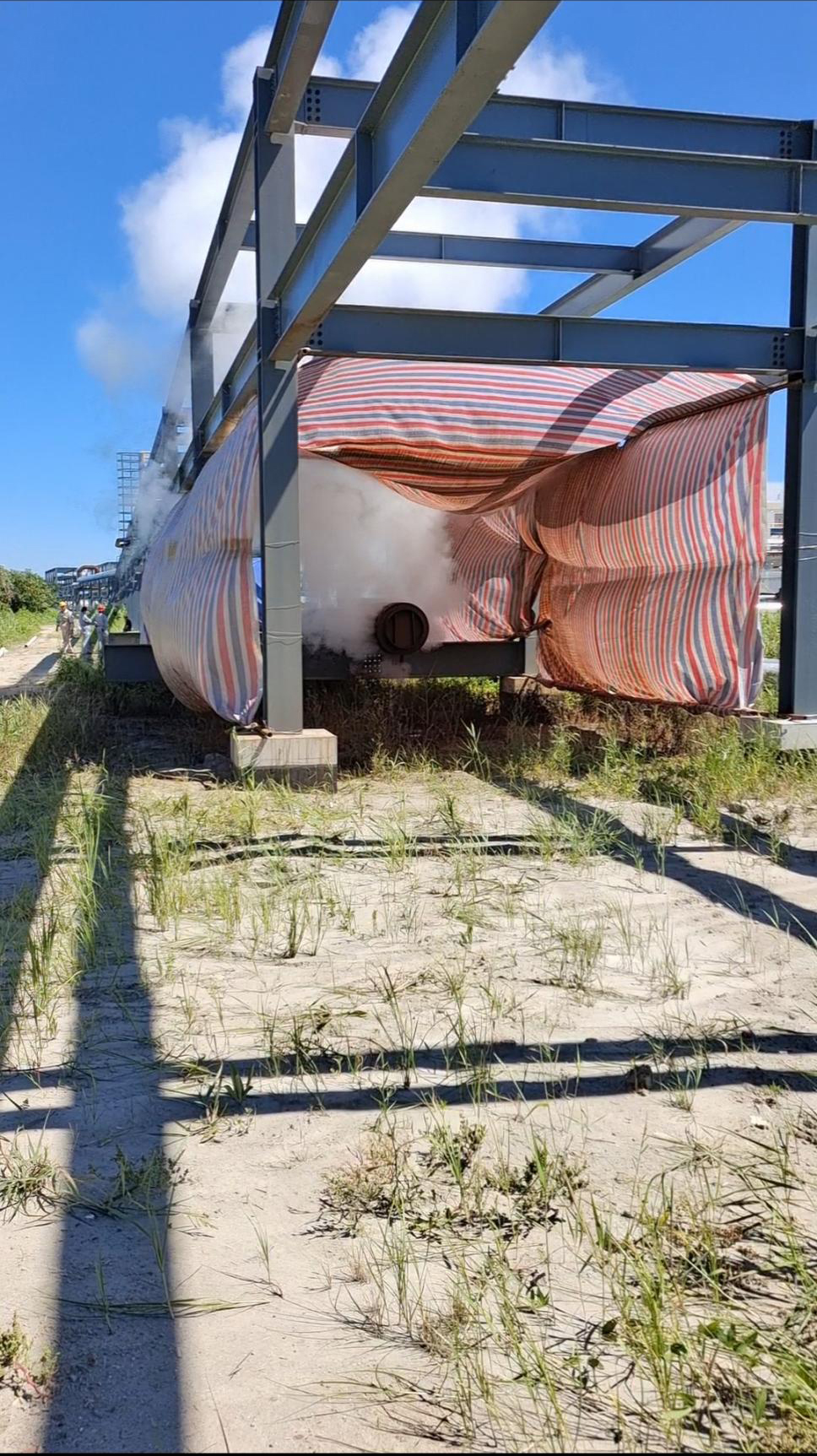 南通經(jīng)濟(jì)技術(shù)開(kāi)發(fā)區(qū)化工園區(qū)公共管廊延伸總承包工程,起點(diǎn)在江山農(nóng)化停車場(chǎng),沿通盛南路一路向南至污水處理廠,后經(jīng)通旺路、江河路、通達(dá)路,最后終點(diǎn)至通秀路與海堡路交叉口,總長(zhǎng)10公里。該段管線于6月27日完成水壓試驗(yàn)。7月28日開(kāi)始在管道末端加裝消音器且用彩條布包圍保護(hù)管廊后吹掃,7月29日順利完成江山農(nóng)化廠門(mén)口至大寶理末端DN700蒸汽管道主管(共5公里)的吹掃工作,8月1日正式供汽。剩余些許保溫工作正陸續(xù)收尾,土建工程及管廊工程現(xiàn)均已全部結(jié)束。該工程合同額4976萬(wàn),2023年11月進(jìn)場(chǎng)施工,預(yù)計(jì)工程將于2024年8月30日完成。(蔣洋)